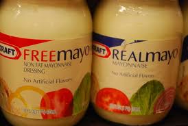 アメリカにはFat-FreeやLow Fat食品が沢山ありますが、FDA(食品医薬品局)はFat-Freeの場合脂肪は1食分あたり0.5グラム以下、Low Fatは1食分3グラム以下と定義しています。マヨネーズを作るには卵、オイル、レモンかお酢、そしてマスタードを使います。ということは殆ど脂肪のみなんですよね、じゃどうやってFat-Freeにするかというと砂糖と炭水化物(スターチ)を大量に使うのです。他のFat-Freeの食品も砂糖、小麦粉、コーンスターチ、塩など別の食品をつかって脂肪分無しという食べ物にしてしまうのです。本当だったら脂肪分がないとまずくて食べれないものも、このような糖分や塩を使って食べやすいようにしてしまいます。なので、カロリー的にはFat-Freeの方が高い食品もあるのです。